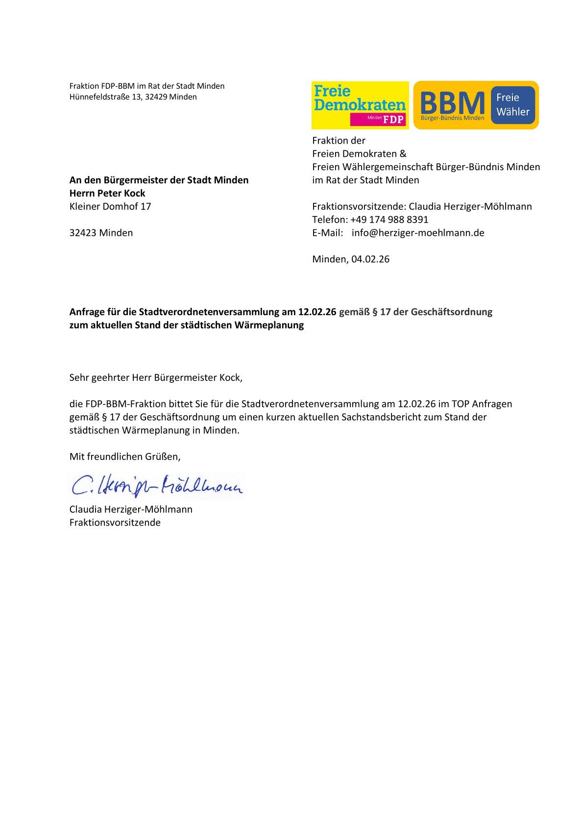 Anfrage der Fraktion BBM-FDP zur städtischen Wärmeplanung