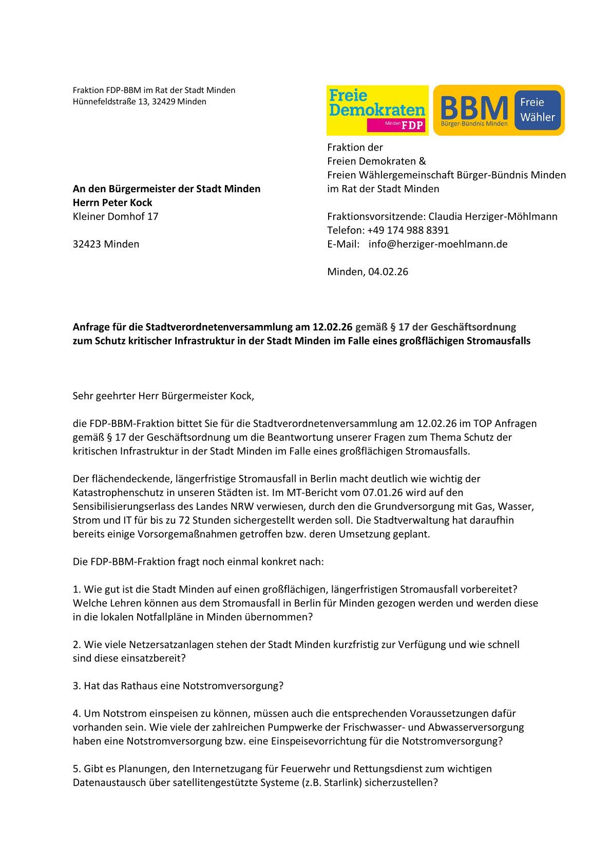Anfrage an die Stadtverordnetenversammlung 12.02.26 Kritische Infastrukur der Stadt Minden